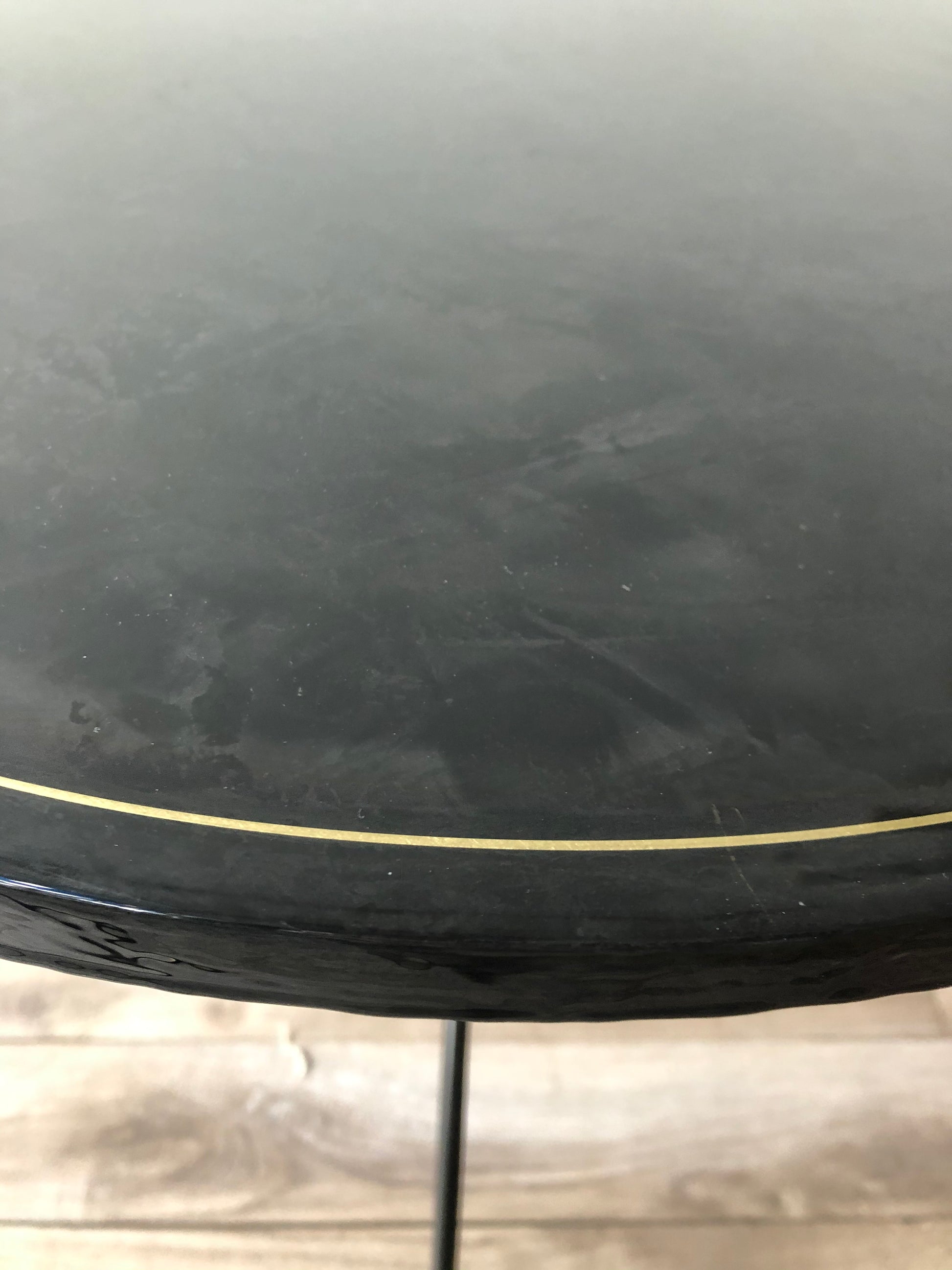 A pair of contemporary poured resin round black tables on an iron tripod base with solid brass sabots.